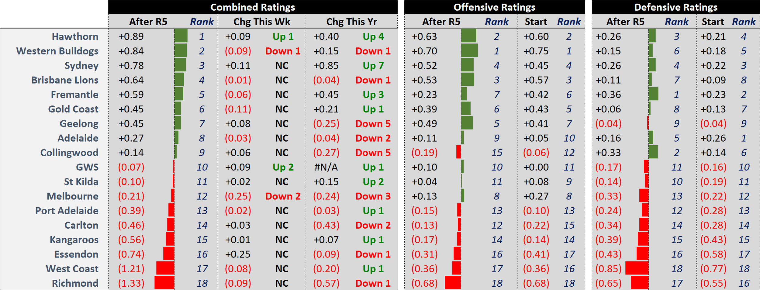 /MoSHBODS changed the ranking of only four teams this week, and only one by more than a single spot: GWS up 2 into 10th.