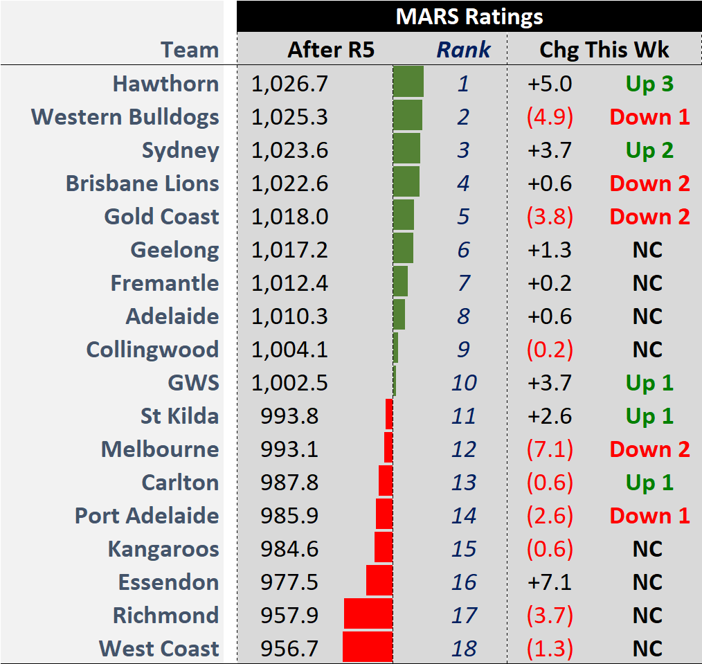 MARS moved 10 teams, including five by more than a single spot: Hawks up 3 into 1st, Swans up 2 into 3rd, Lions down 2 into 4th, and Suns down 2 into 5th, and Dees down 2 into 12th.