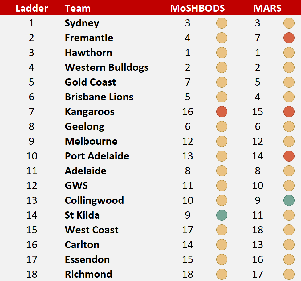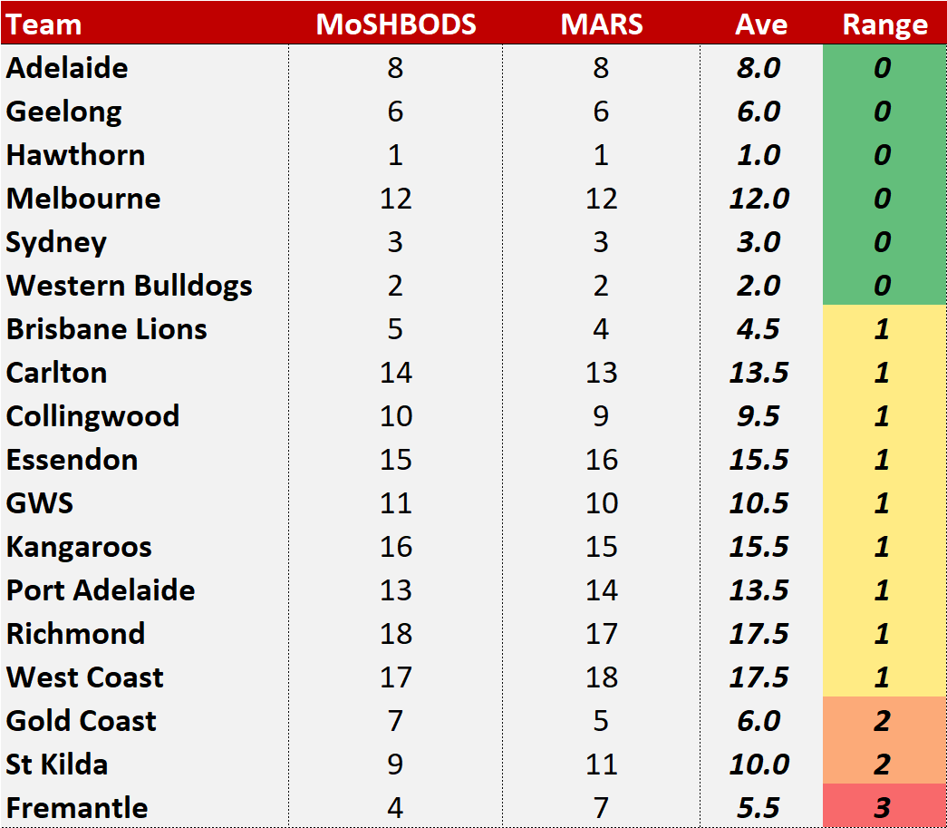 They disagree most about the ranking of Fremantle, who MARS have 7th and MoSHBODS 4th.