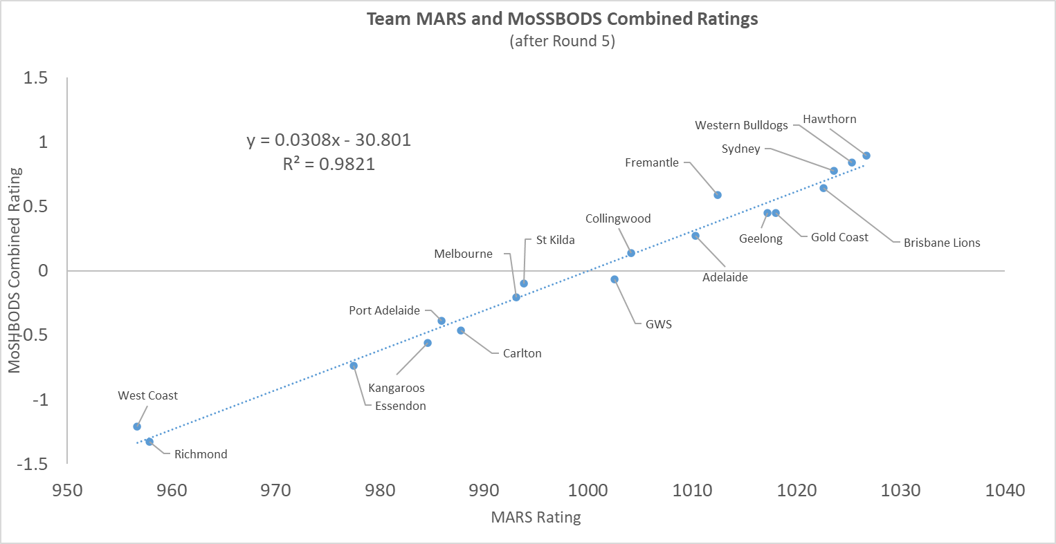 The correlation between MoSHBODS’ Combined Ratings and MARS’ Ratings stands at +0.99 and, roughly speaking, each team’s Combined MoSHBODS Rating is about 0.031 times its MARS Rating less 31.