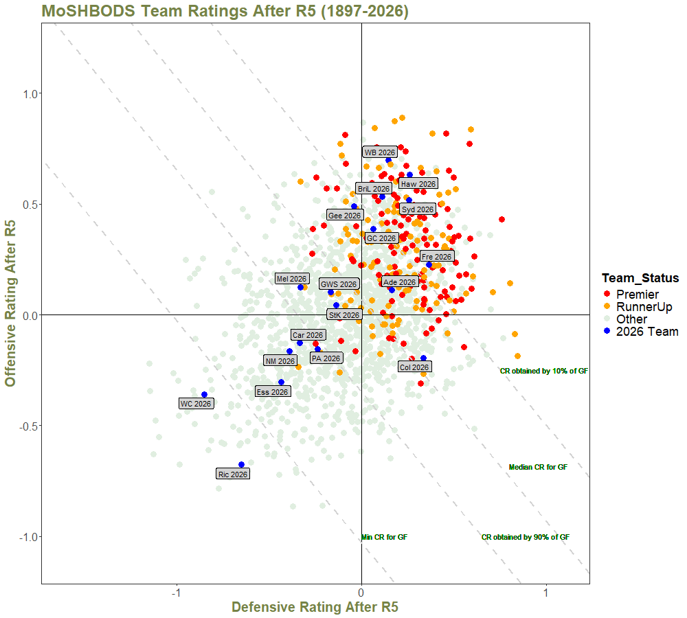 We can put the MoSHBODS Ratings into an historical context by looking at the offensive and defensive ratings that teams in other seasons had after Round 5 (recognising that this will have meant different numbers of games per team in different years)