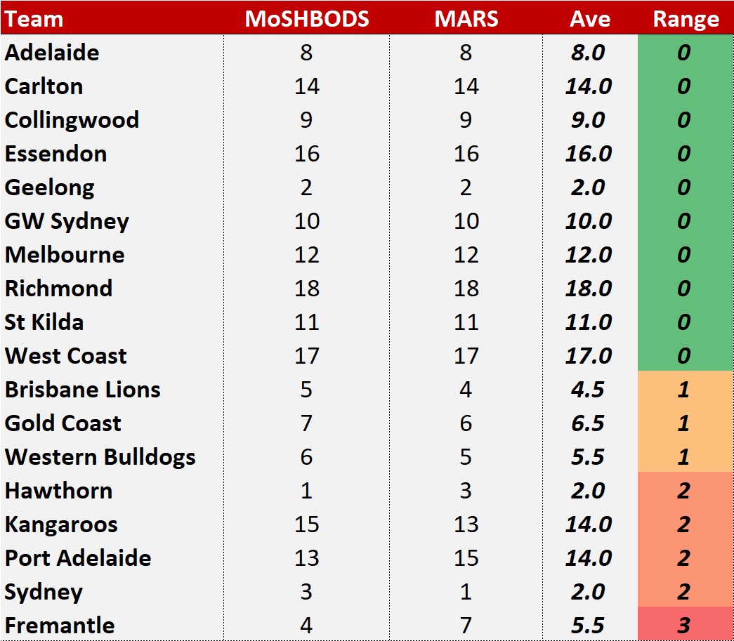 They disagree most about the ranking of Fremantle, who MARS have 7th and MoSHBODS 4th.