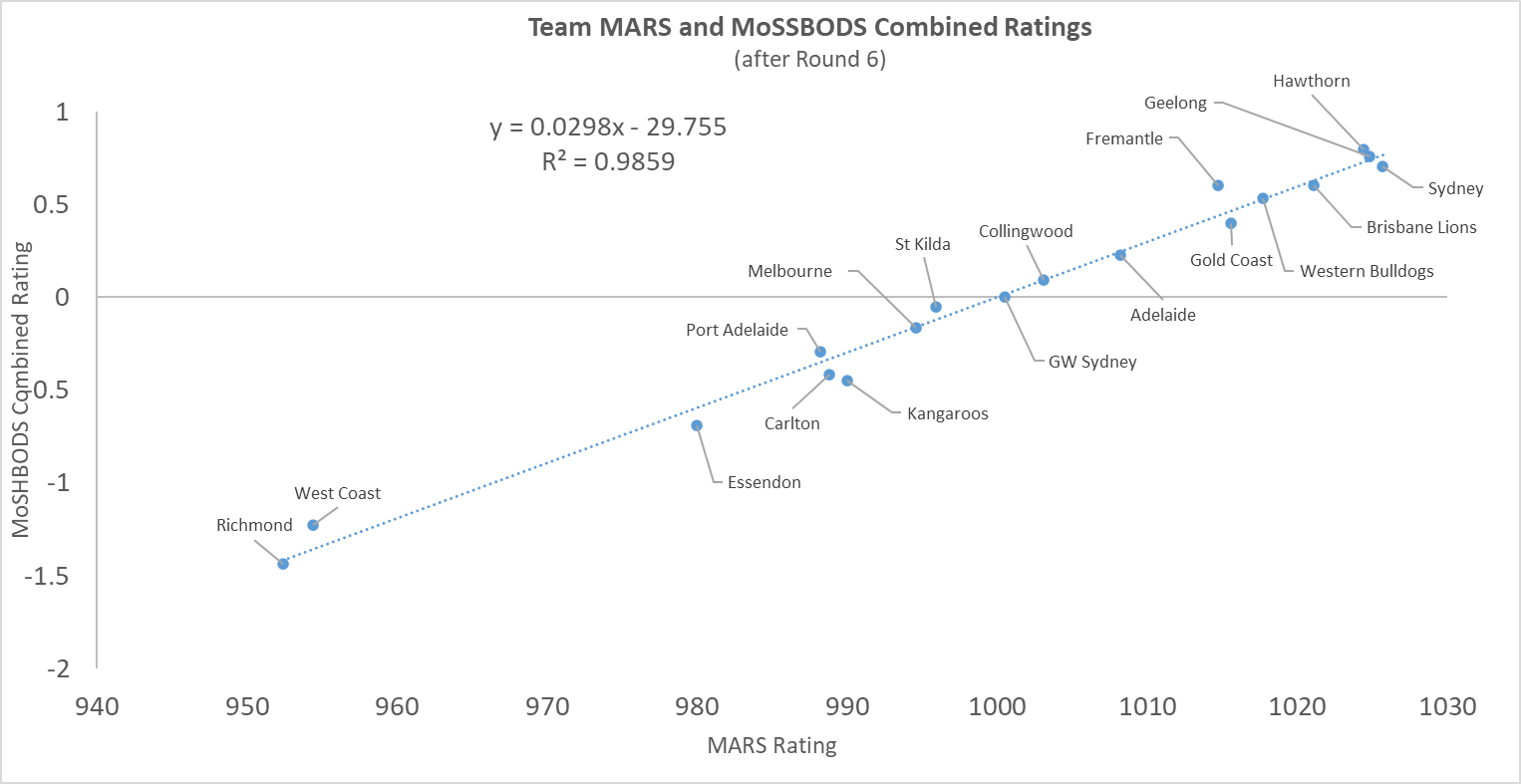 The correlation between MoSHBODS’ Combined Ratings and MARS’ Ratings stands at +0.99 and, roughly speaking, each team’s Combined MoSHBODS Rating is about 0.03 times its MARS Rating less 29.8.