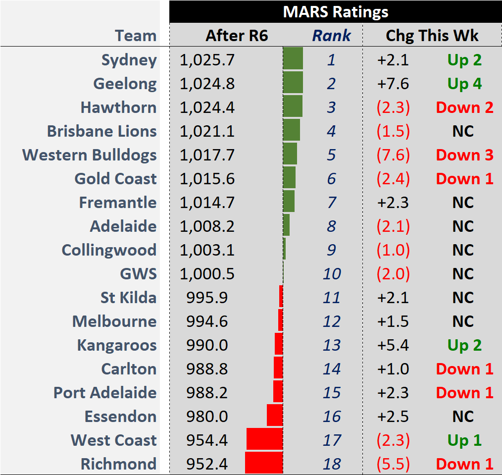 MARS moved 10 teams, including five by more than a single spot: Sydney up 2 into 1st, Geelong up 4 into 2nd, Hawthorn down 2 into 3rd, Western Bulldogs down 3 into 5th, and North Melbourne up 2 into 13th.