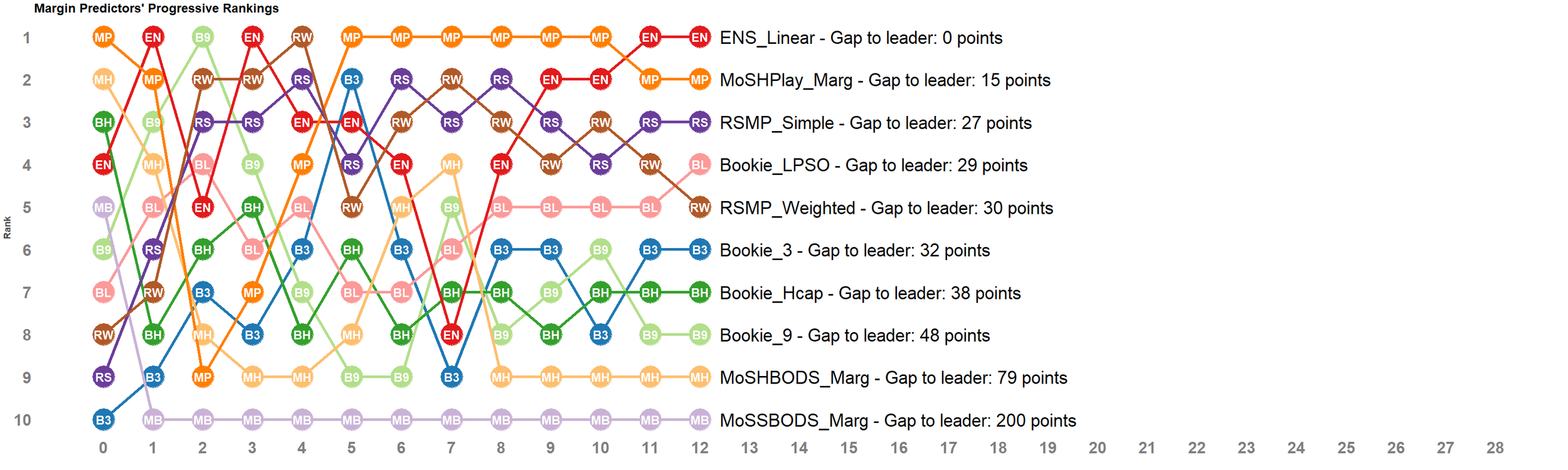 Margin prediction was, on average, about 14.5 points per game harder this week, but easiest for Bookie_Hcap, whose mean average error (MAE) of 36.9 points per game was almost a whole point per game better than next best, Bookie_9’s 37.9 points per game. ENS_Linear recorded the second-worst MAE of 39.3 points per game, but still sits atop the Leaderboard, now just under 15 points ahead of MoSHPlay_Marg.