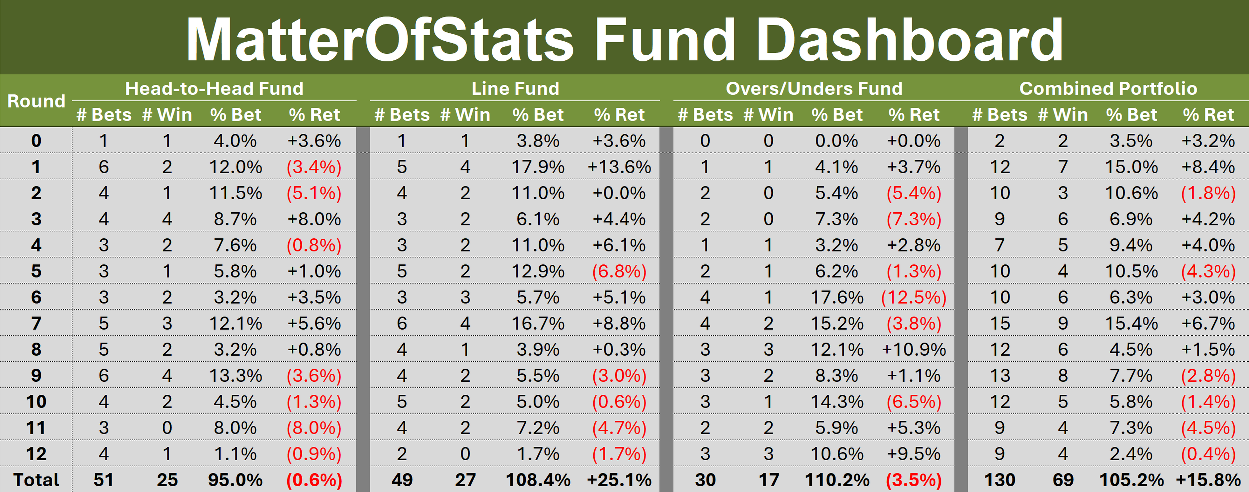 For the second successive round, only the Overs/Unders Funds made money this week, meaning that, once again, Investors lost money, albeit not a lot.