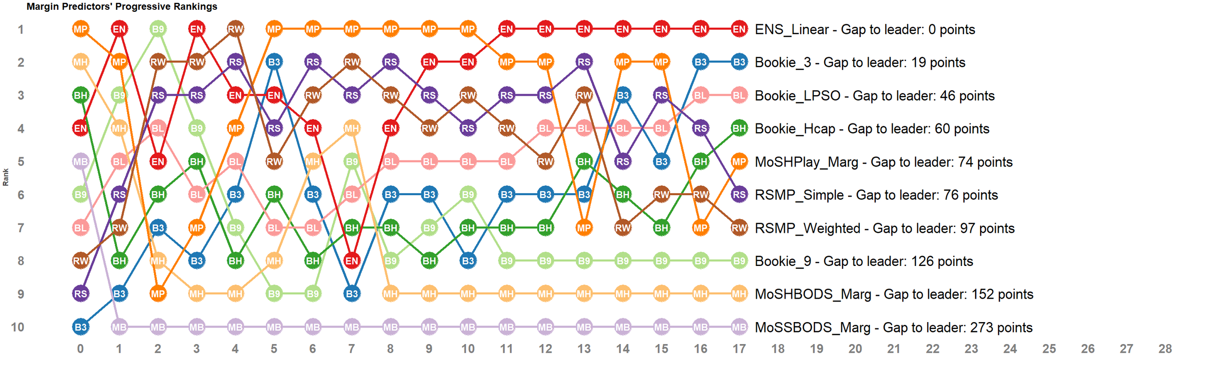 As a result, MoSHPlay_Prob still sits atop the Leaderboard ahead of MoSHBODS_Prob, with Bookie_LPSO in 3rd, and MoSSBODS_Prob still in last place.