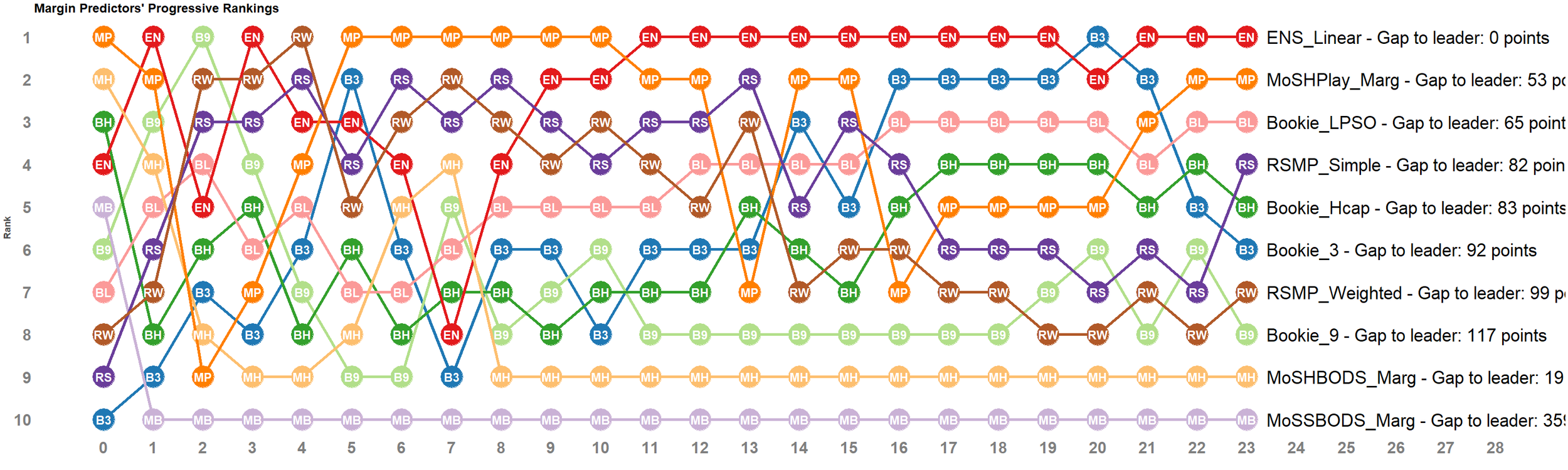 The round-by-round history of Margin Predictor rankings appears below, and shows the Top 3 Predictors, ENS_Linear, MoSHPlay_Marg, and Bookie_LPSO remaining unchanged, with RSMP_Simple leaping three places into 4th.