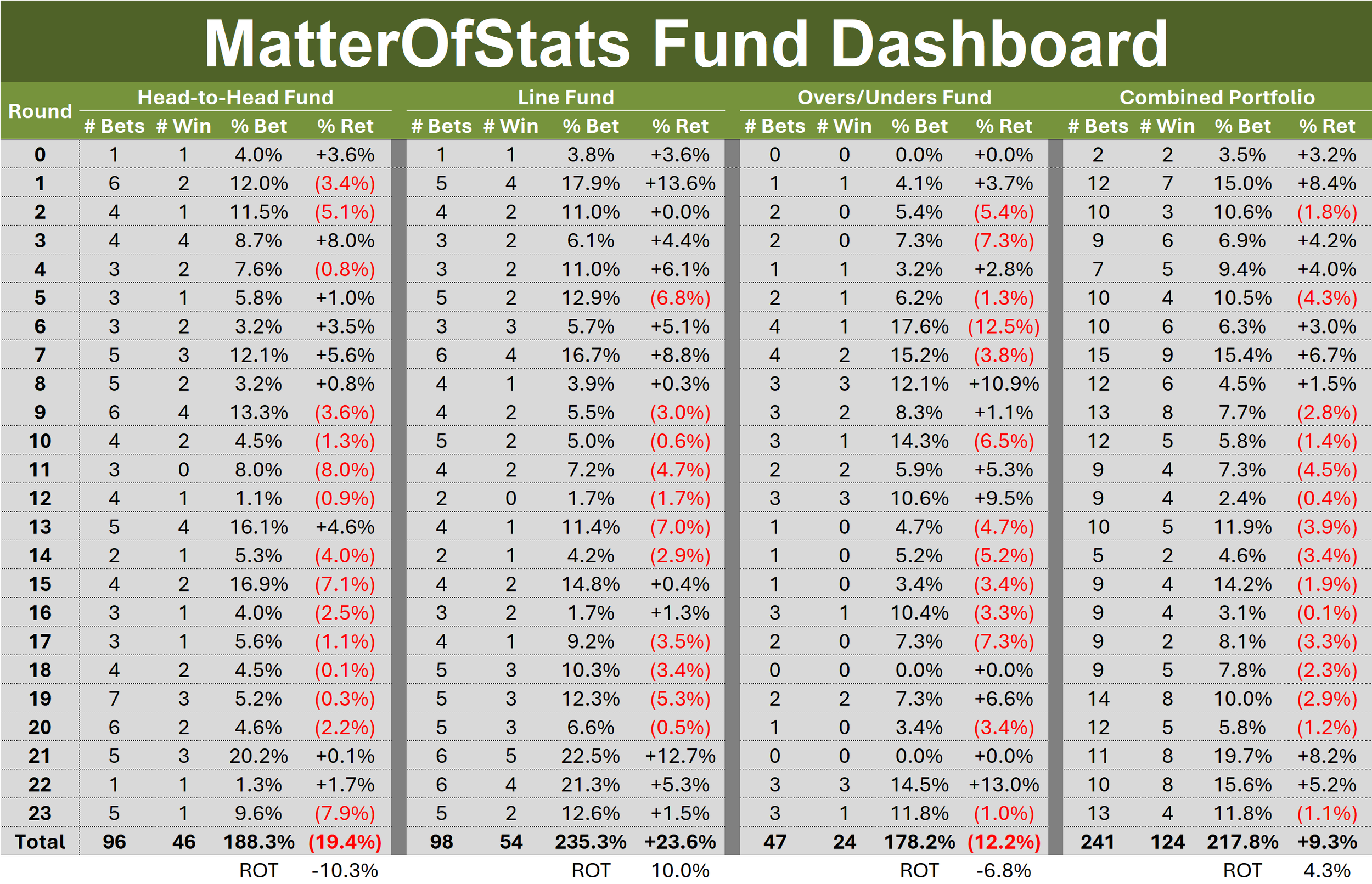 A small Combined Portfolio loss this week, thanks mostly to the Head-to-Head Fund, whose losses could not be completely erased by the Line Fund.