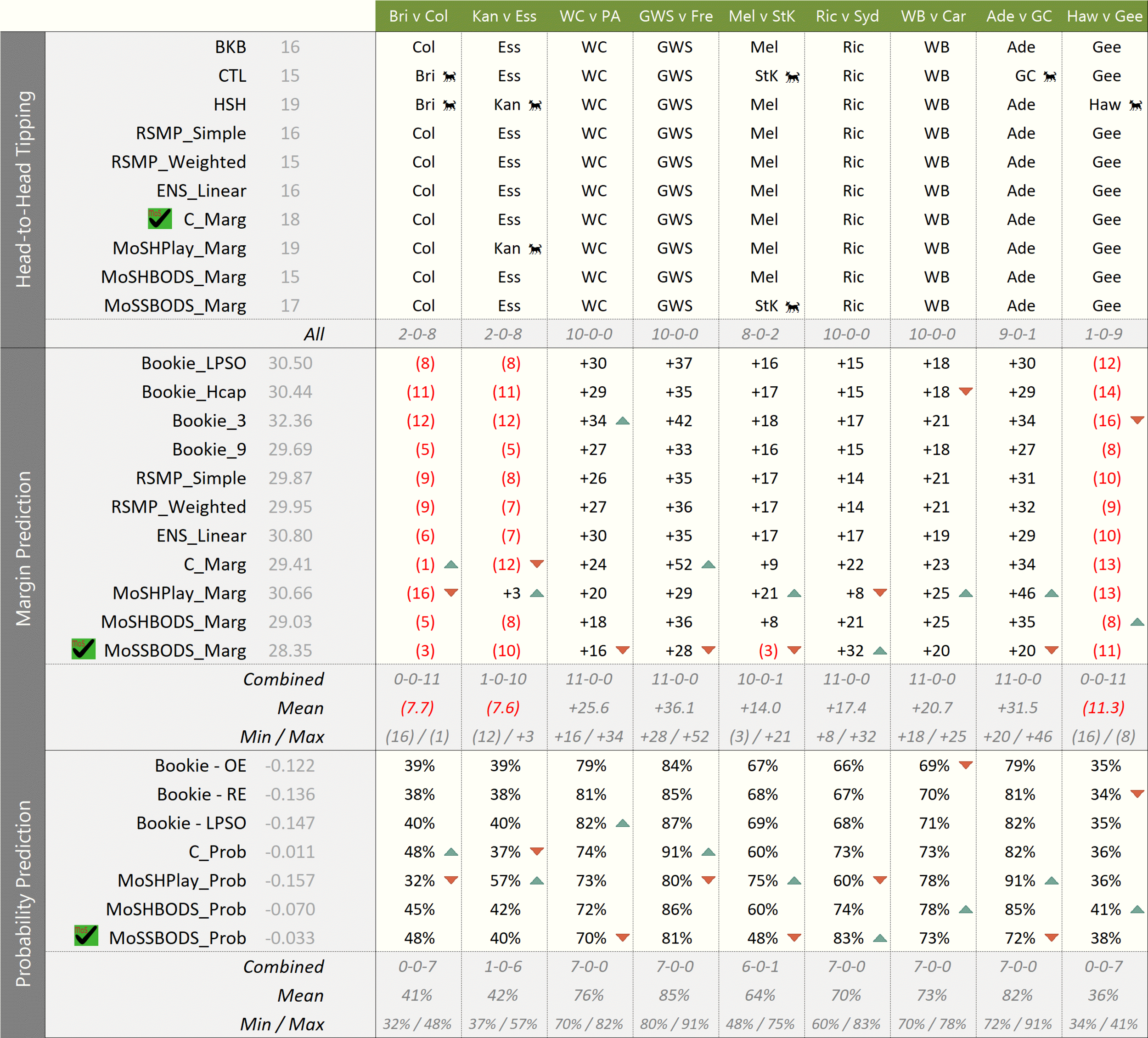 Missed the late West Coast changes (which would, for the record, have moved MoSHPlay to Eagles by 17.5), but there’ve been a few other changes too to the Dogs, Crows and Suns, which are reflected below