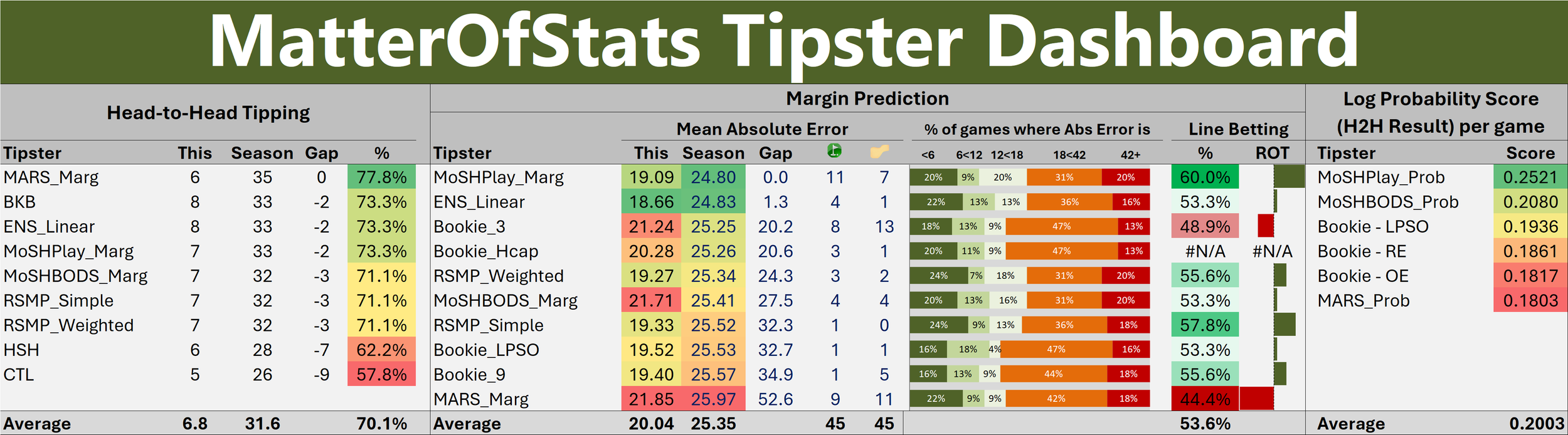 /With a little more contrarianism this week, final scores ranged from Control the Ladder’s five from nine to Bookie Knows Best’s and ENS_Linear’s eight from nine, all of which left MARS_Marg still in 1st place and now on 35 from 45 (78%) but only two tips clear of Bookie Knows Best, ENS_Linear, and MoSHPlay_Marg.