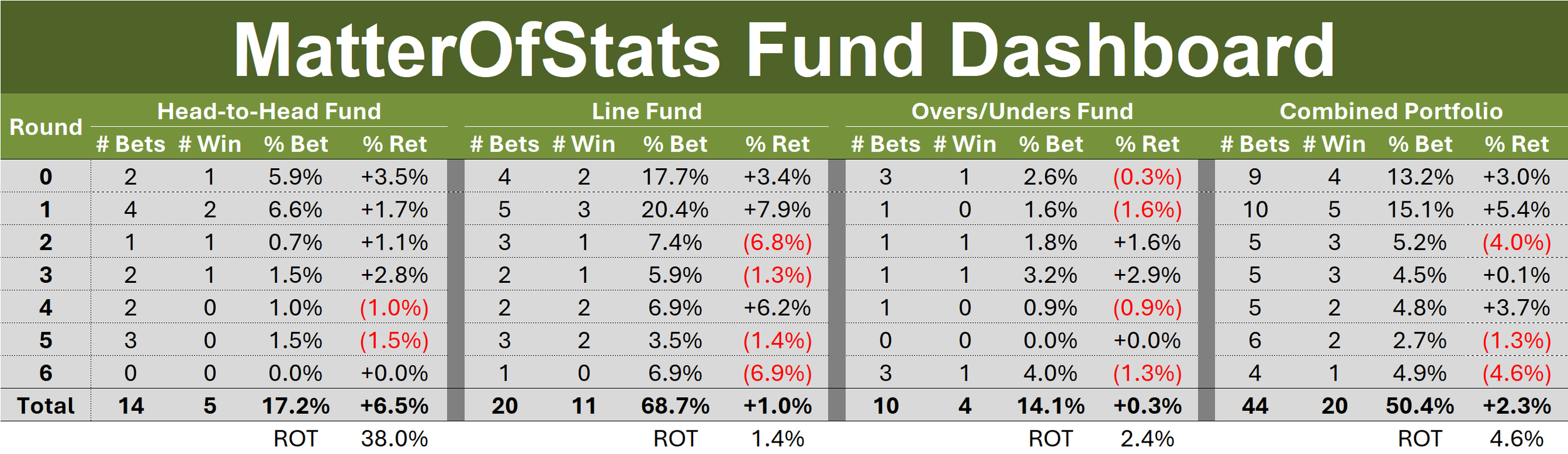 That left the Combined Portfolio now up by only 2.3c on a +5% ROI and a 0.5 turn.