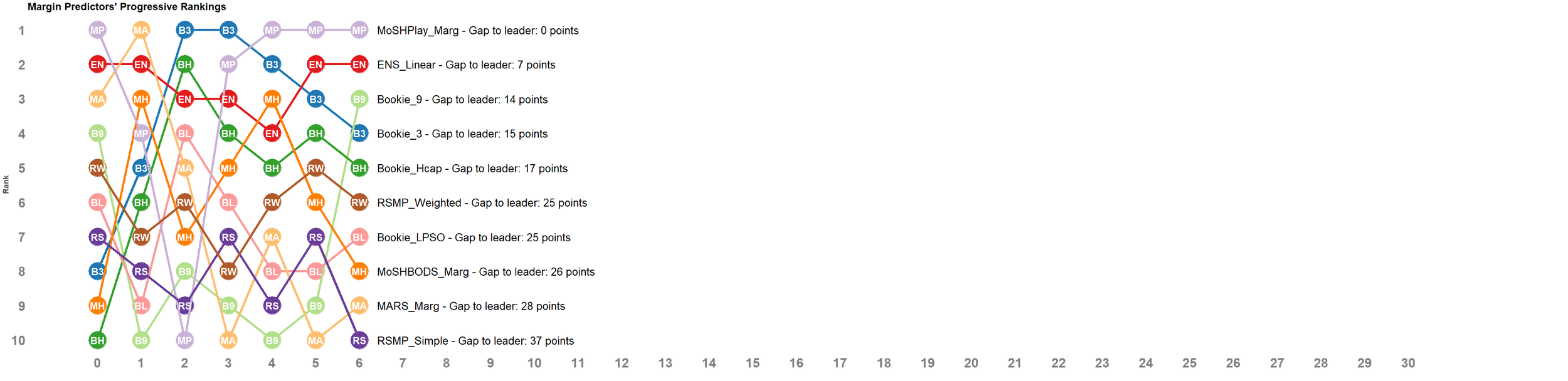 MoSHPlay_Marg still heads the Leaderboard and now by just under 7 points from ENS_Linear who is a further just under 8 points ahead of Bookie_9.