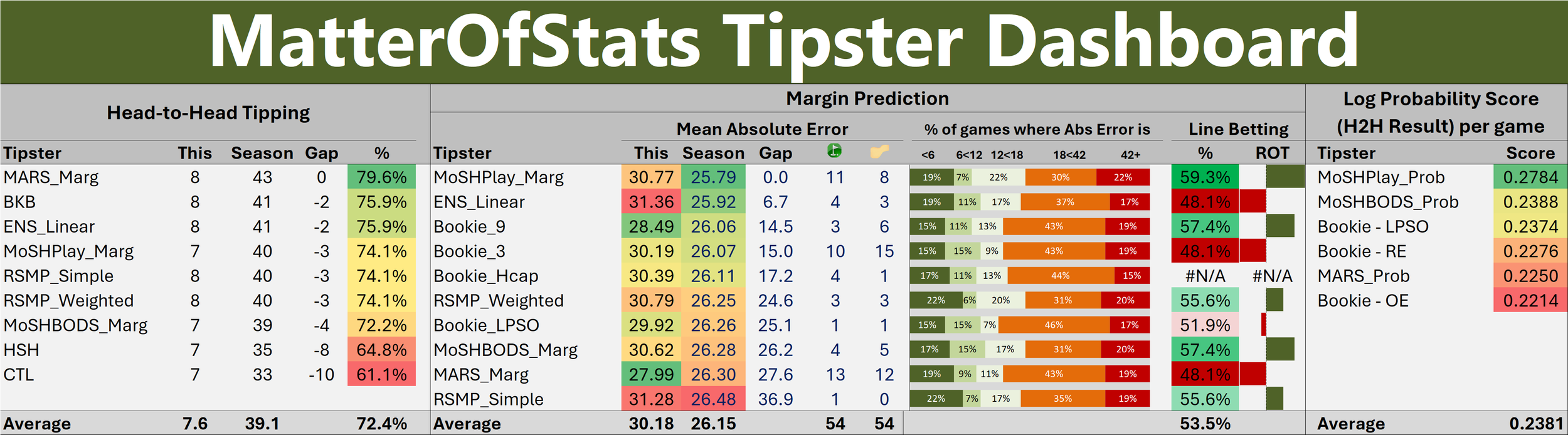 Log probability scores were all highly positive this week, and highest for Bookie_LPSO and MARS_Prob. MoSHPlay_Prob retained top spot on the Leaderboard ahead of MoSHBODS_Prob, with Bookie_LPSO taking third, and MARS_Prob knocking Bookie_OE into last place.