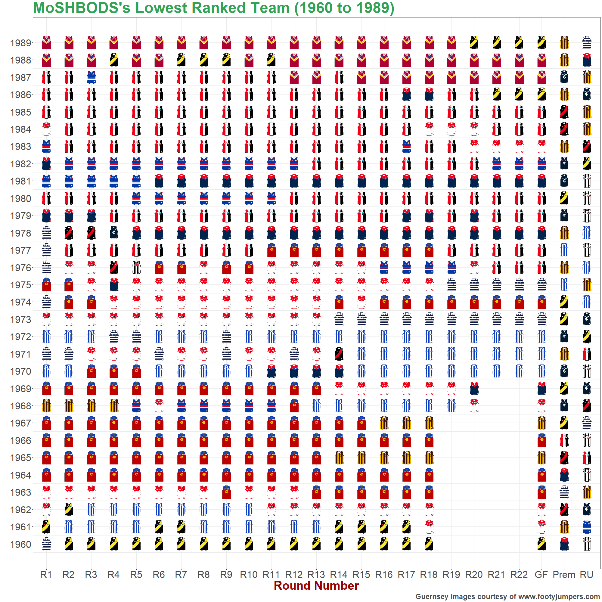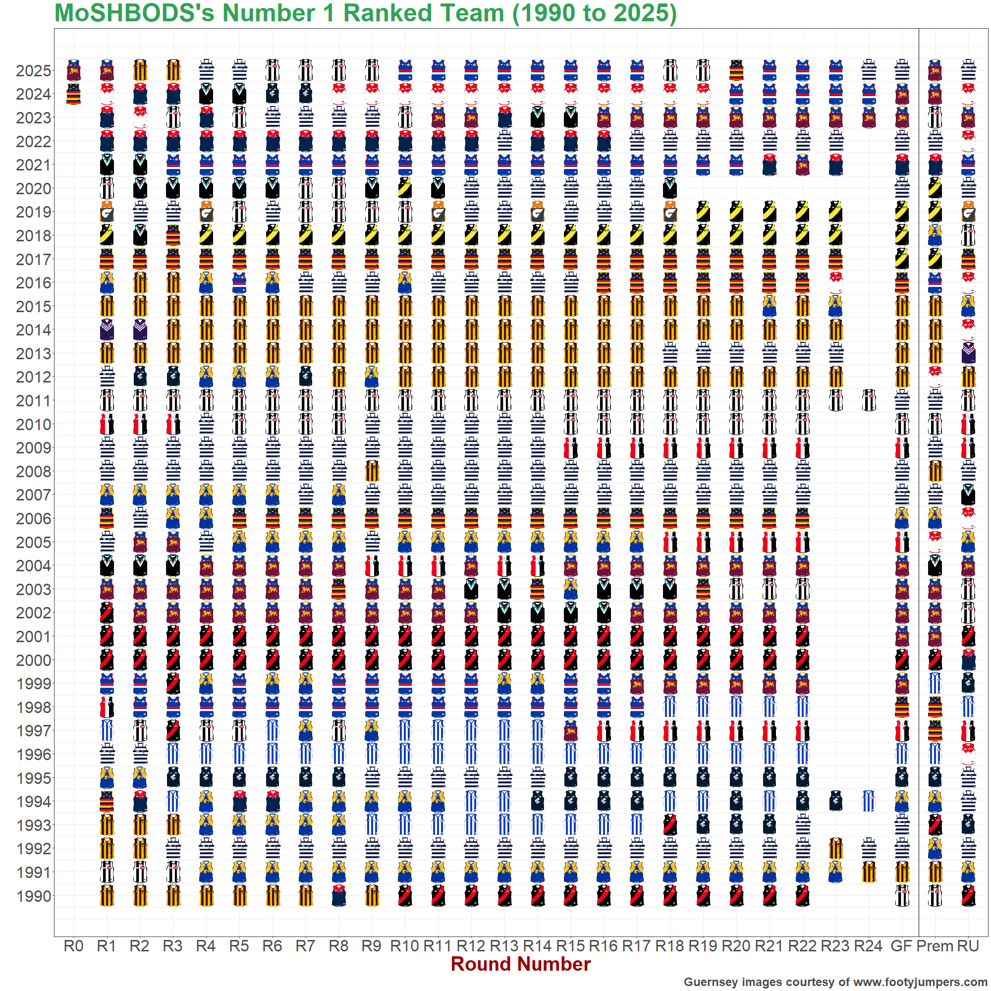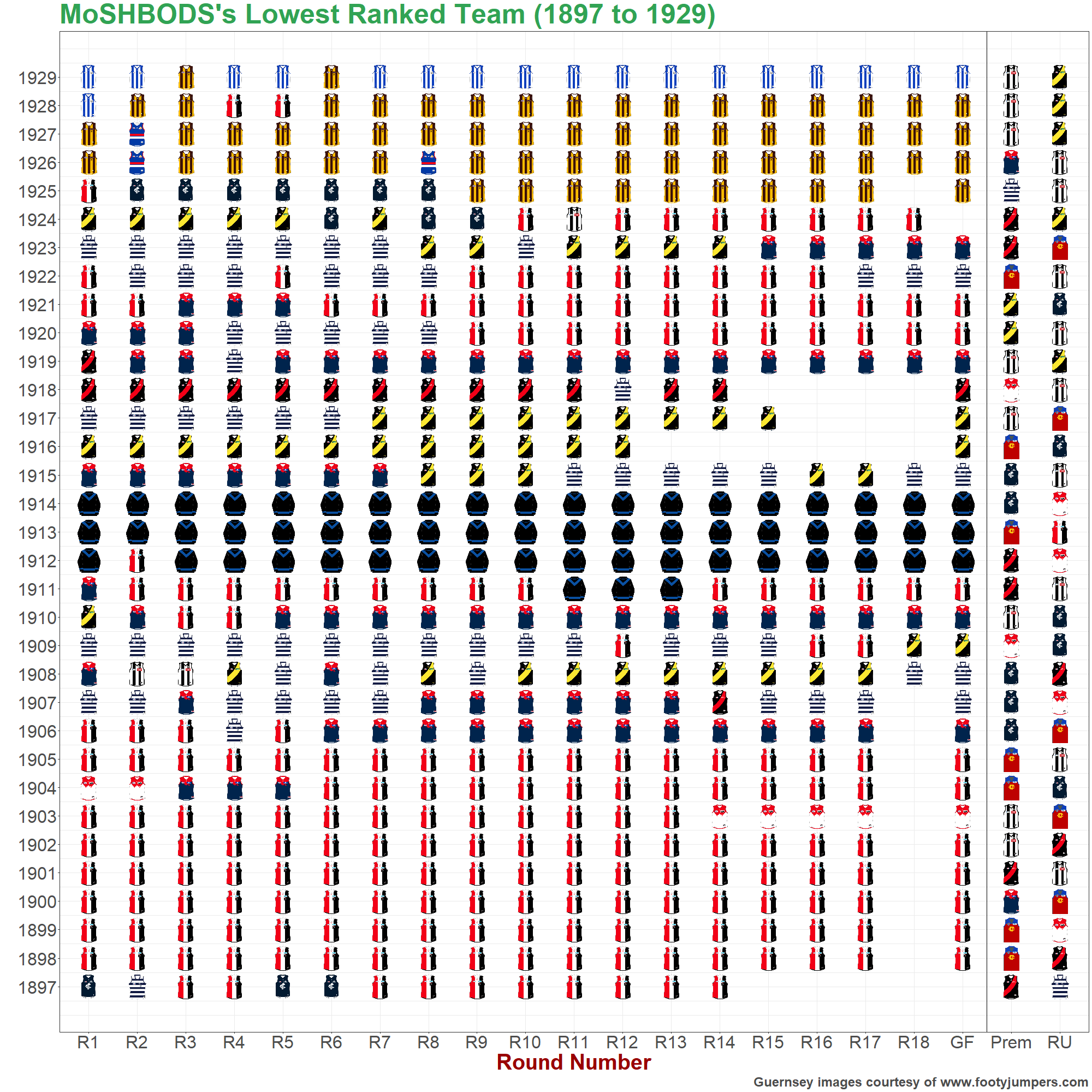The charts below show the highest- and lowest-rated teams of the MoSHBODS System at the end of every home-and-away round and every season, as well as the premiers, runners up and wooden spooners in each year.