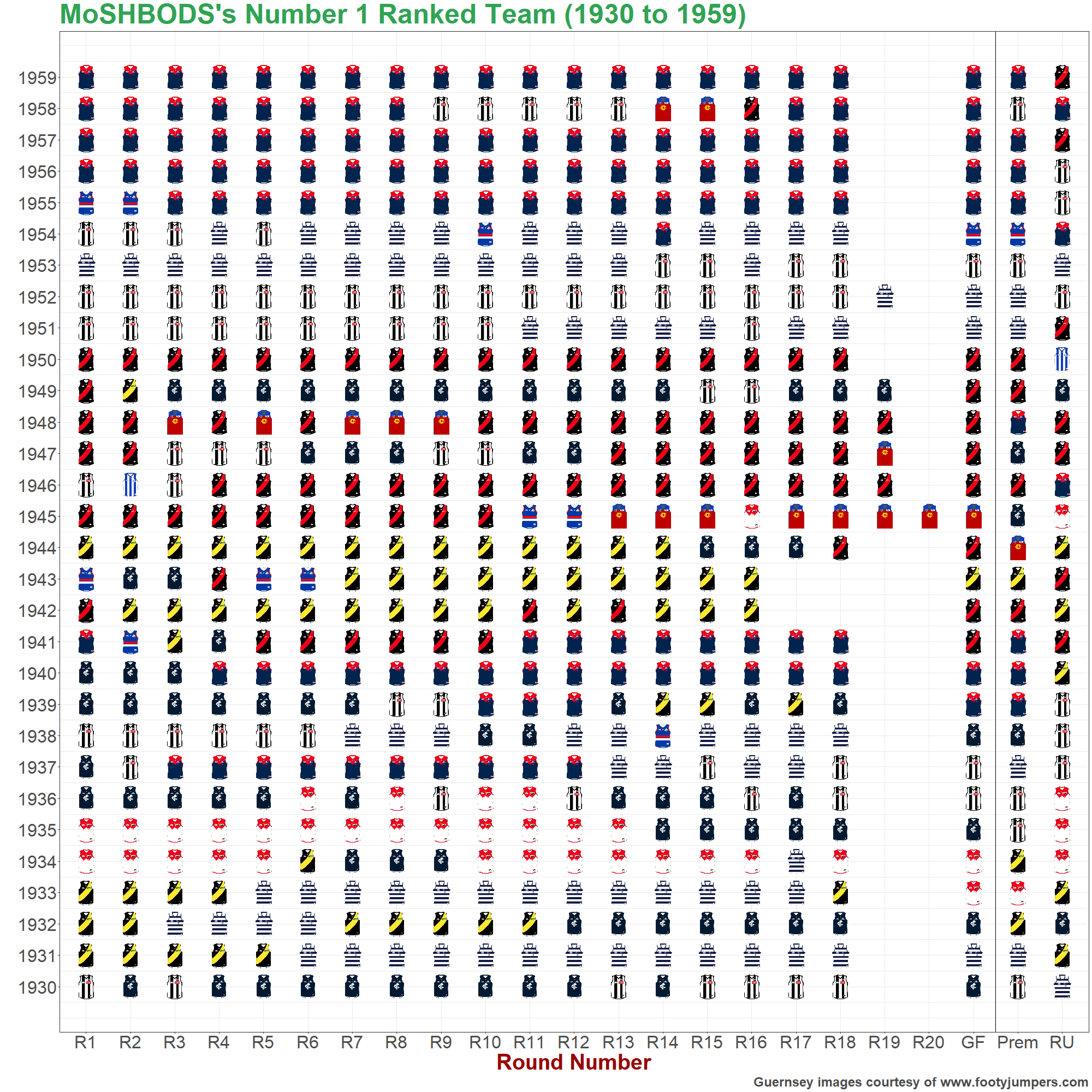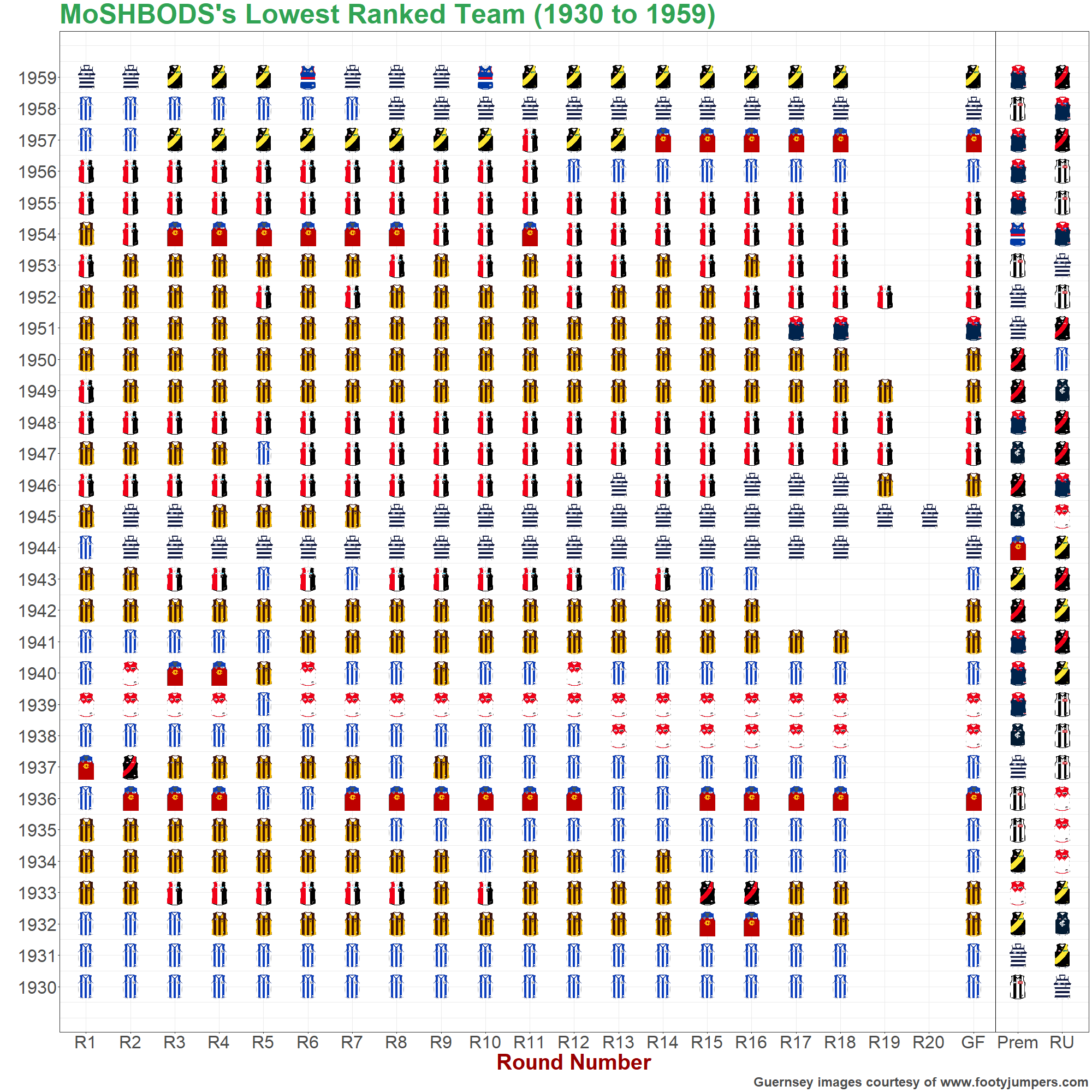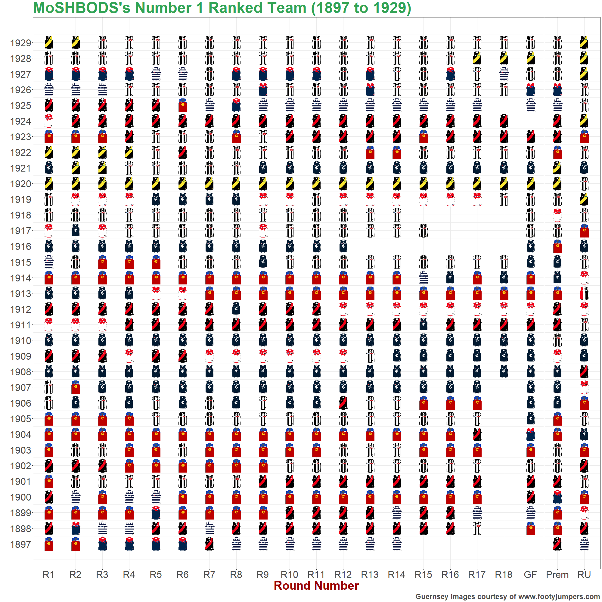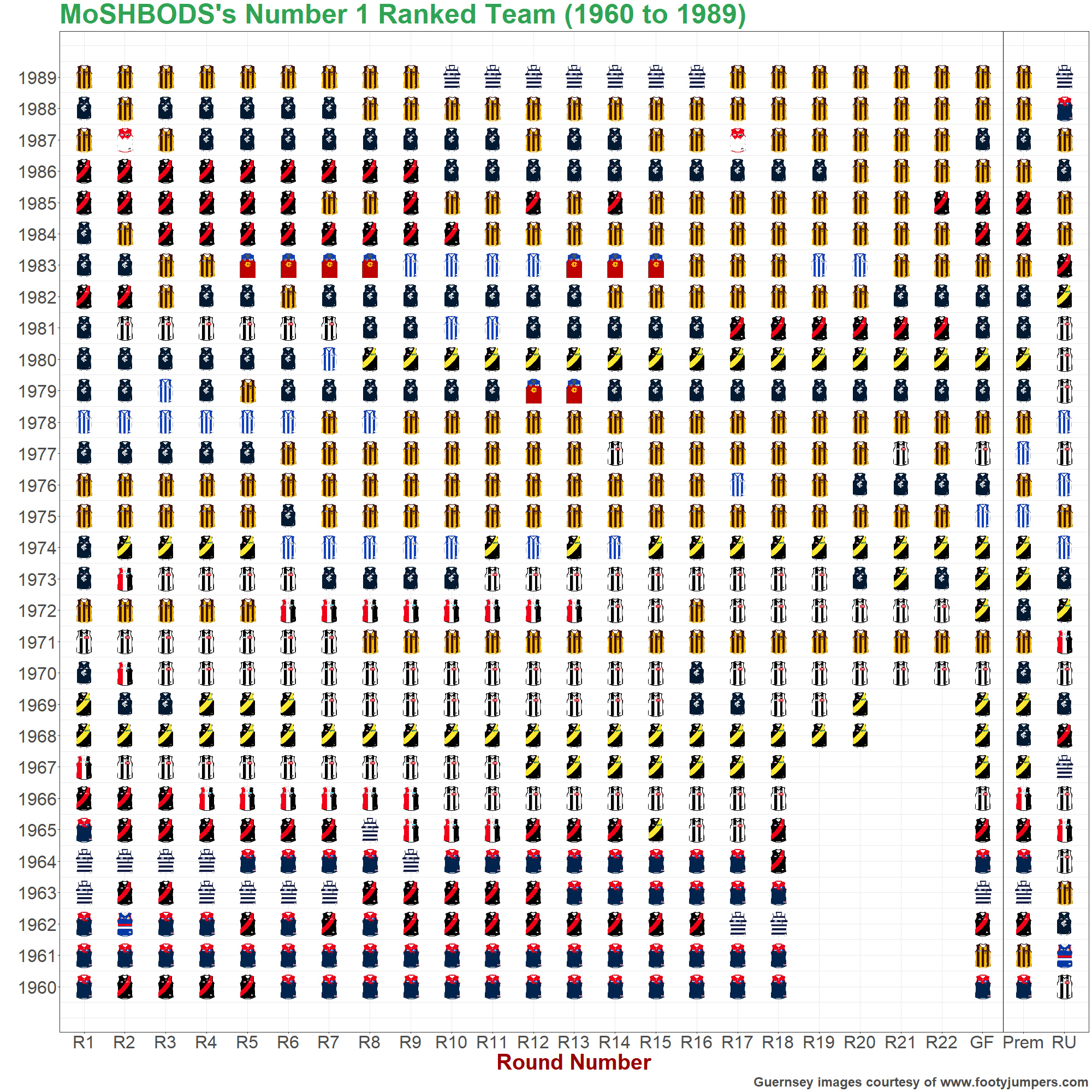 The charts below show the highest- and lowest-rated teams of the MoSHBODS System at the end of every home-and-away round and every season, as well as the premiers, runners up and wooden spooners in each year.