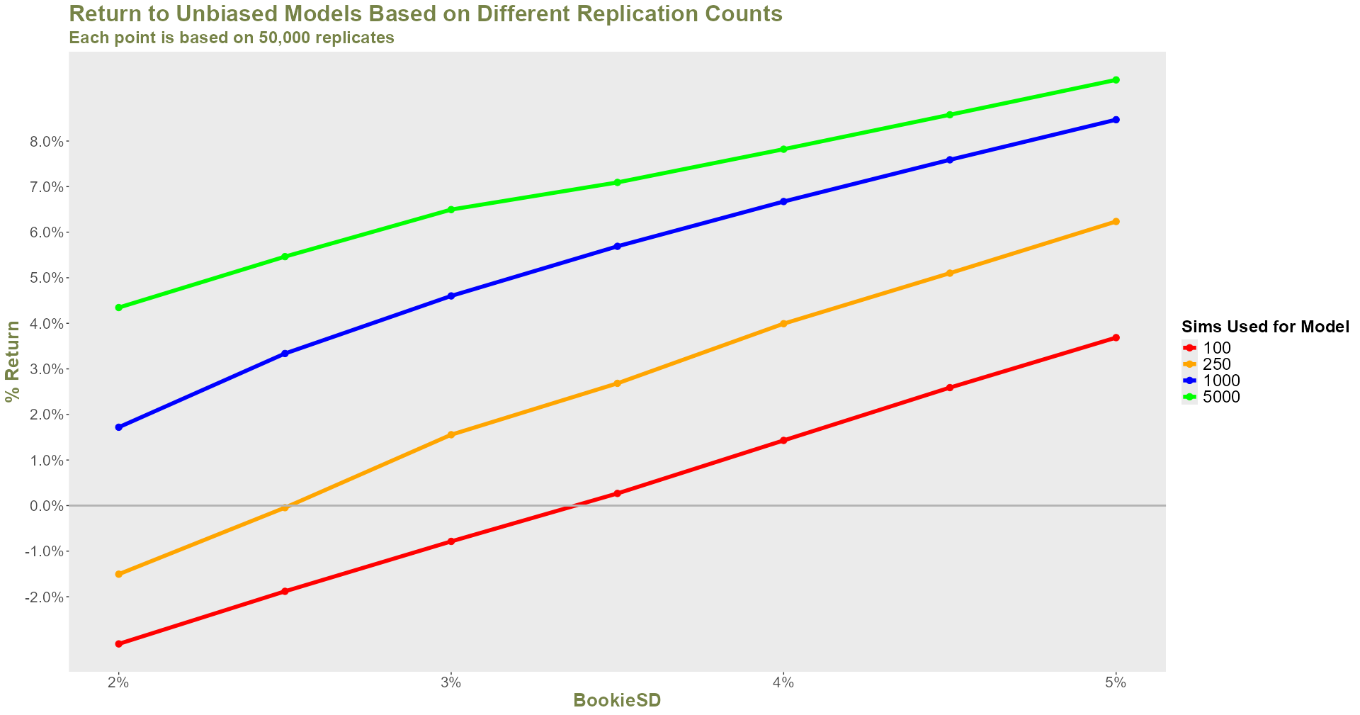 In our final chart we look at the return on wagering and find that, on average, the model variants based on 1,000 or 5,000 replicates are net profitable against every bookmaker.