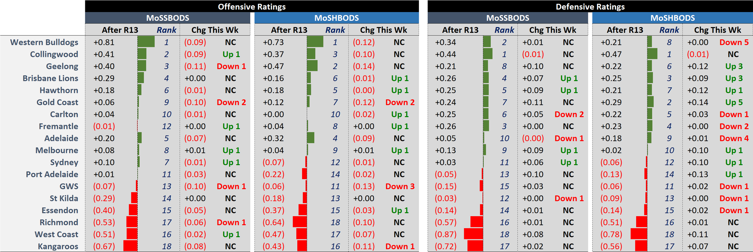 On MoSHBODS, 10 teams are now rated positively on offence and defence (up 1), 8 are rated negatively on both (up 1), none is rated positively on offence but negatively on defence (down 2), and none is rated negatively on offence but positively on defence (no change).