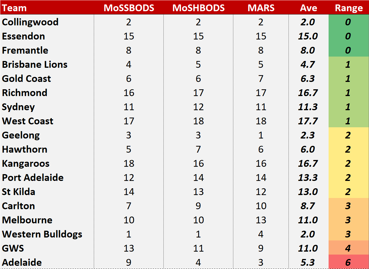 Looking finally at the range of rankings that the three Systems have attached to each team we find that Adelaide has the widest range of rankings at six spots, and that there are four other teams whose rankings span more than two spots.