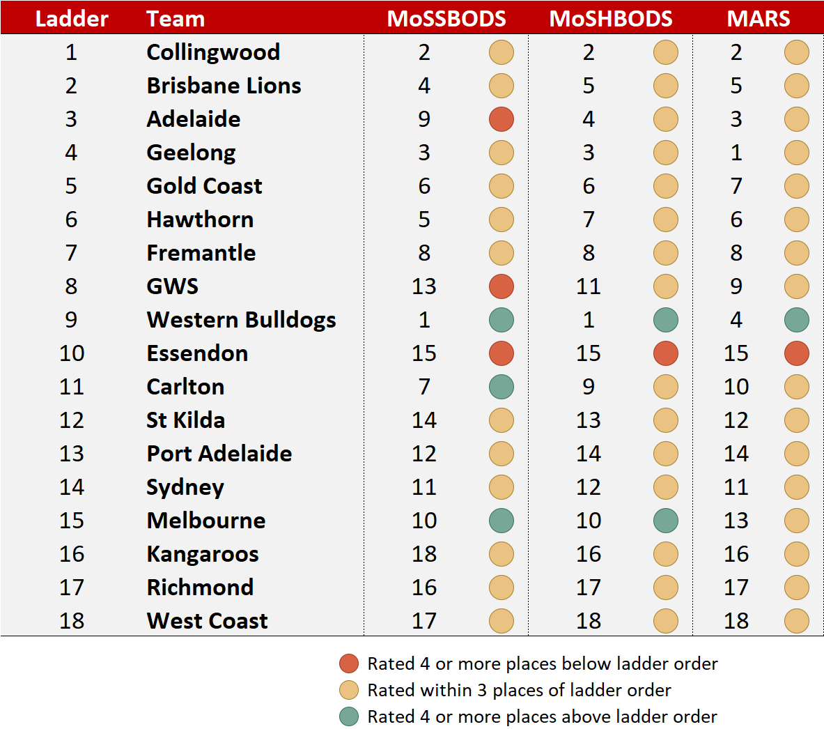 And, finally, it’s time to take a look at MARS, which re-ranked only four teams this week, putting Geelong into 1st ahead of Collingwood, and Adelaide into 3rd ahead of Western Bulldogs.