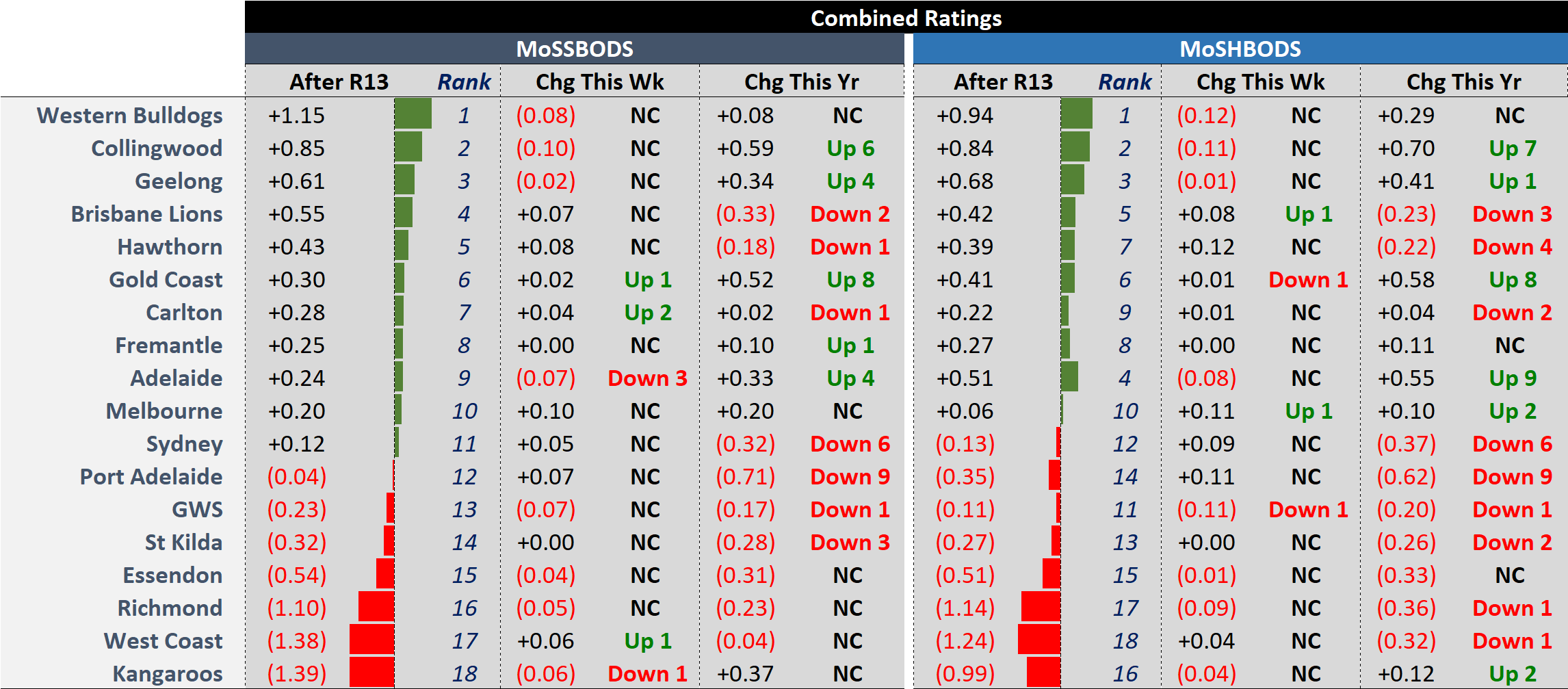 In total, MoSSBODS moved only five teams this week and MoSHBODS only three, with Carlton (up 2 to 7th) and Adelaide (down 3 to 9th) the only multi-spot movers on MoSSBODS. No team moved by more than a single spot on MoSHBODS.