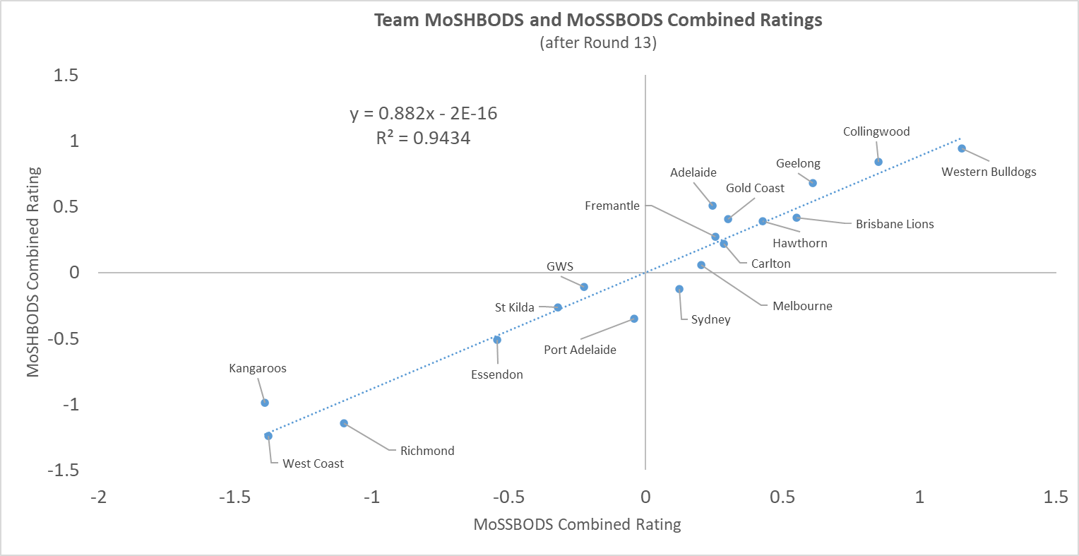 The correlation between MoSSBODS and MoSHBODS Combined Ratings now stands at +0.971 and, roughly speaking, each team’s Combined MoSHBODS Rating is about 0.88 times its Combined MoSSBODS Rating.