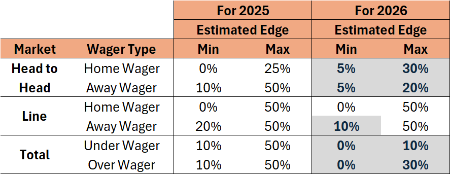 In the line market the only change is a lowering of the threshold on the minimum estimated edge requirement for a wager on the away team.