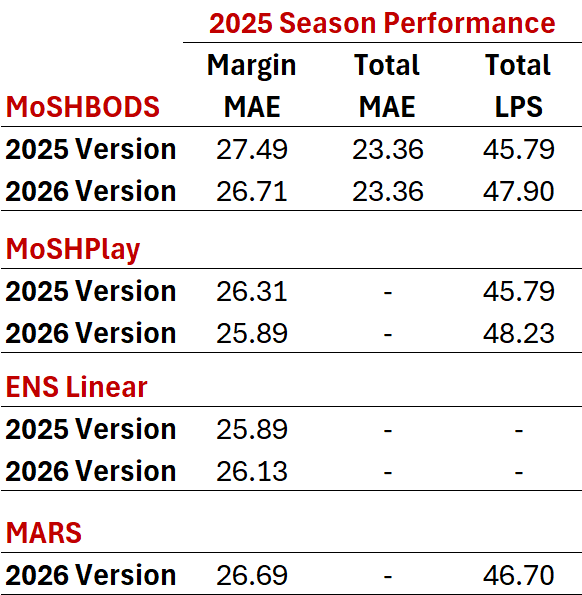 the 2026 versions of MoSHBODS and MoSHPlay produce superior Margin MAEs to their predecessors for the 2025 season