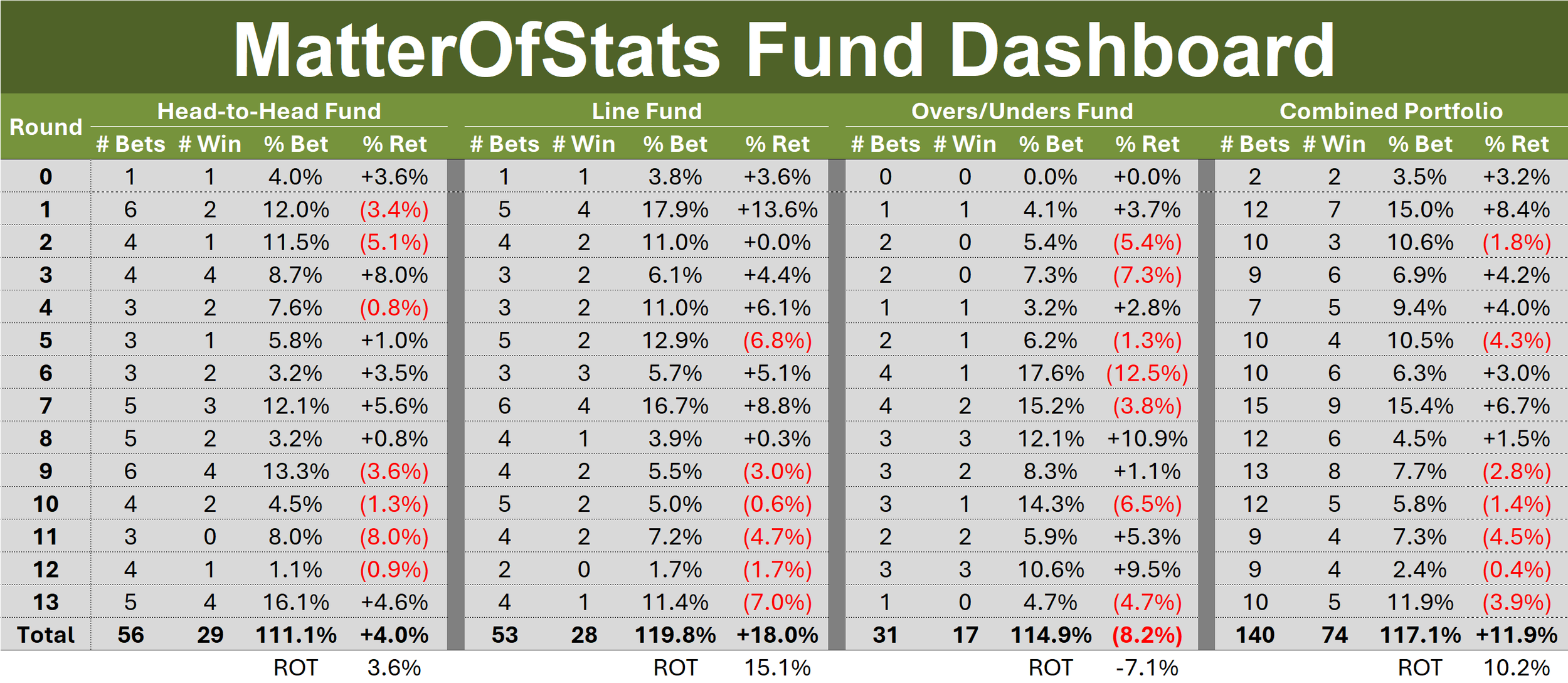 It was the Head-to-Head Fund’s turn to be the only profitable one this week, but its gains were insufficient to outweigh the losses by the Line Fund.